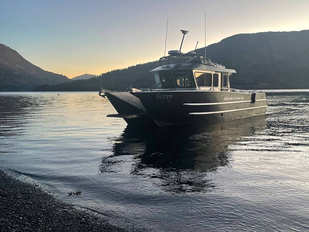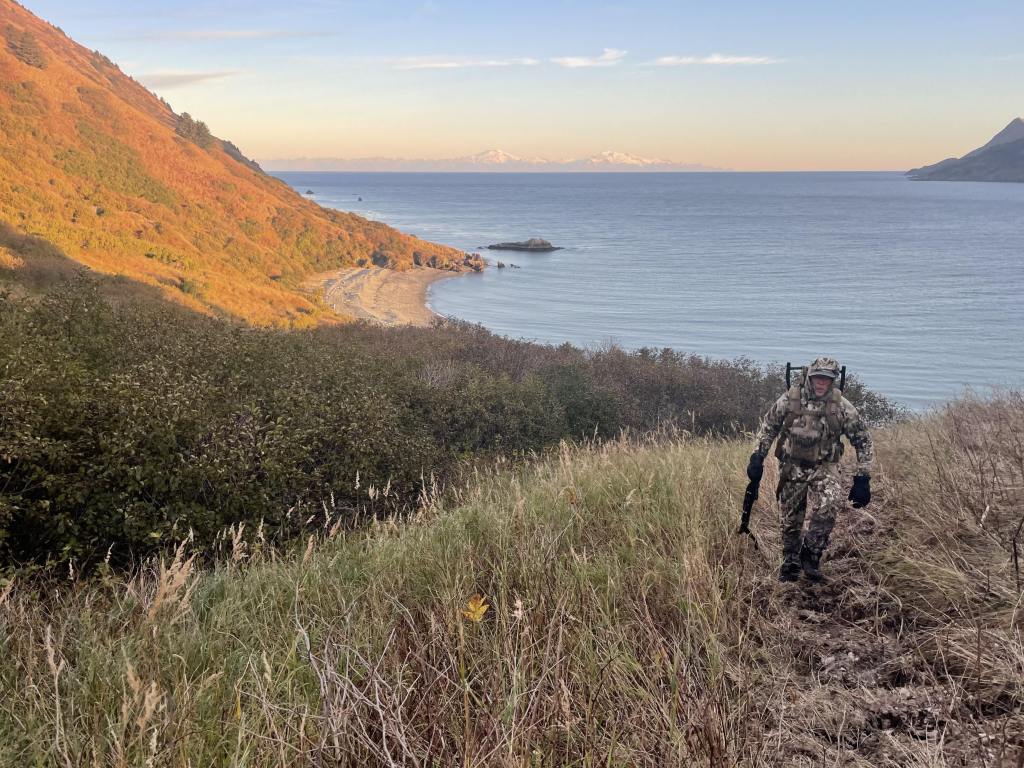 With full meat packs we arrived back on top of the mountain at dark with one headlamp between us. We radioed the boat for a pickup. We could not see the large alder patches in the dark and managed to pick one of the worst routes down the mountain. Two hours later we finally got to the boat. Upon our return to camp, we were required to celebrate by drinking out of an Elk Horn with multiple shot glasses, accompanied by Elk tenderloin.