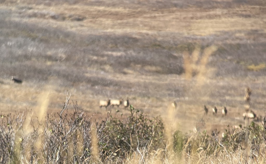 Hans beat me to the top and spotted the Elk herd. Viewing through binoculars, lunching on a 1700-foot peak, required a strategy to approach the herd. The solution was a two-mile stalk, hugging the mountain perimeter to stay out of sight; the final stalk would be through high grass surrounded by pockets of noisy brush.